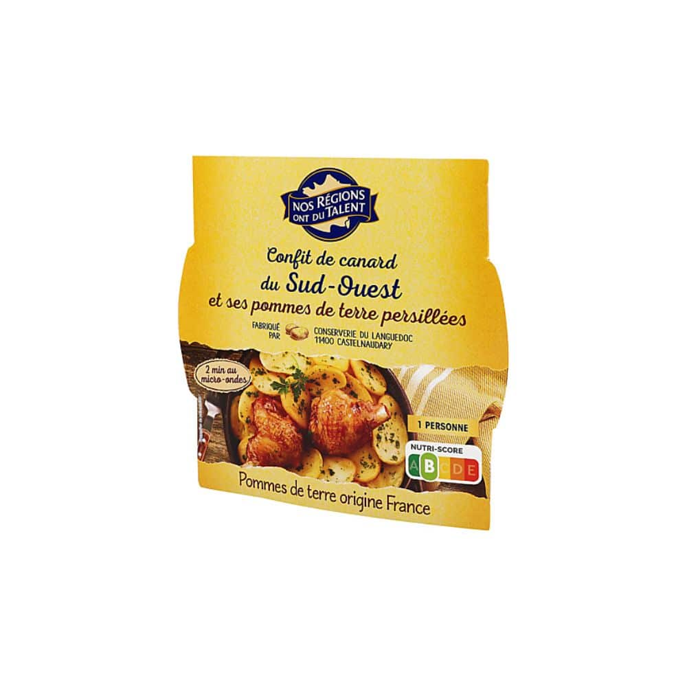 Ingrédients : Confit de manchons de canard du Sud-Ouest* 47,6 % (manchon de canard du Sud-Ouest*, sel), pommes de terre 43 %, eau, persil 2,3 %, graisse de canard, pulpe d’ail 1 % (ail réhydraté, sel), sel, poivre.