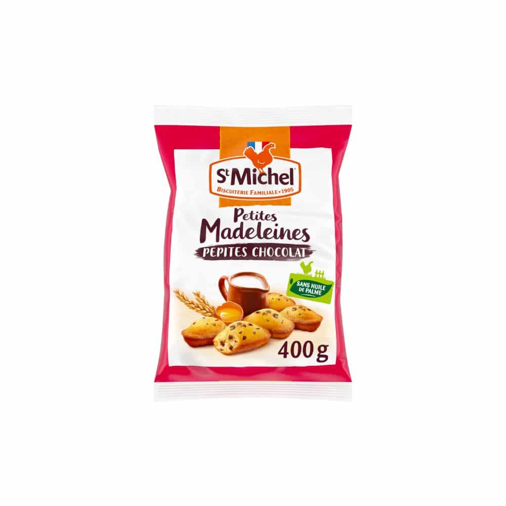 farine de BLÉ 27%, sucre, huile de colza, ŒUFS 14%, sirop de glucose, pépites de chocolat 6,8% (sucre, pâte de cacao, beurre de cacao, émulsifiant : lécithines (SOJA)), stabilisant : glycérol, LAIT demi-écrémé pasteurisé 2,4%, fécule, poudres à lever : carbonates et citrates de sodium (BLÉ), sel, arôme