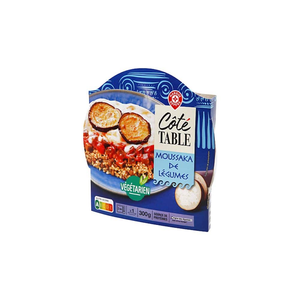 Ingrédients : Eau, aubergine 20 %, boulgour précuit (eau, boulgour) (blé) 17,9 %, pulpe de tomates 8,1 %, lentille verte blanchie (eau, lentille verte) 5,1 %, courgette 4,5 %, poivron rouge 3 %, mozzarella 3 %, oignon, plantes aromatiques, double concentré de tomates 1,6 %, crème, huile d’olive vierge extra, amidon de maïs, farine de blé, sel, huile de tournesol, sucre, épices.