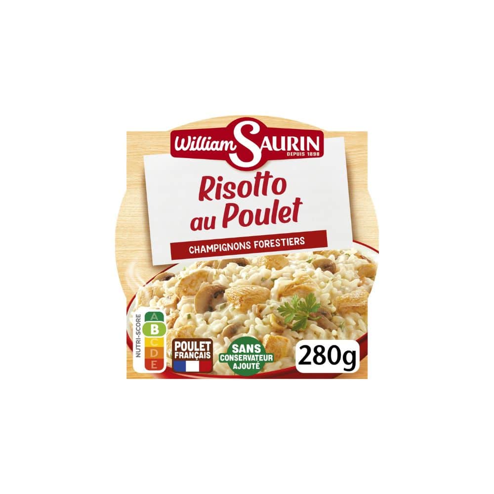Eau, viande de poulet préparée en salaison précuite 25% (viande de poulet, eau, acidifiant : citrate de sodium, sel, caramel eau, sucre), riz précuit 24%, CREME 4,5%, champignons forestiers 4%, champignons de Paris 4%, oignons, vin blanc, amidon, plantes aromatiques (dont persil), PARMESAN, carottes, huile d’olive, arômes naturels, BEURRE, sel, épaississant : gomme guar, protéines de LAIT, jus de citron concentré, épice. Viande origine : France